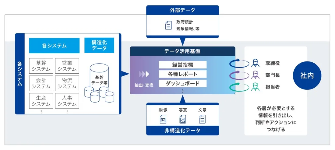 東洋製罐グループは、データドリブン型意思決定の実現に向けて、「データ活用基盤」の構築を推進しています。本基盤では、企業活動を支える基幹、営業、生産システムなどから生成されるデータに加え、画像、映像、文書データ、さらには政府統計などの社外データも統合し、活用できる環境を整えます。