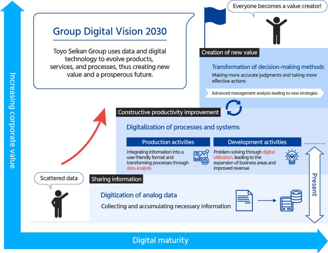 Based on these considerations, we have established "Group Digital Vision 2030," which outlines how Toyo Seikan Group should be in a digitalized society.