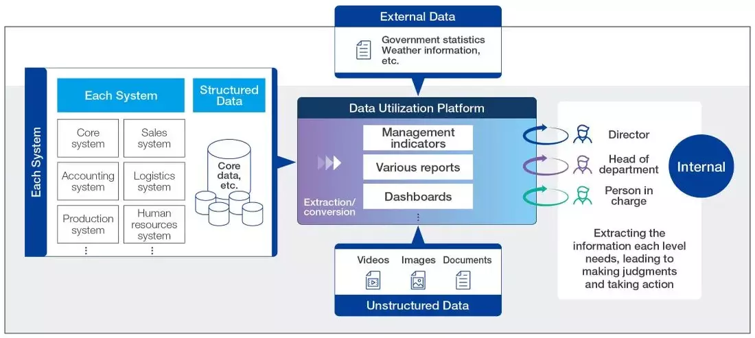 This enables multifaceted and comprehensive analysis, allowing all levels of the organization, from management to those in charge, to quickly obtain the information they need. By gaining specific insights from management indicators, various reports, and dashboards, we aim to rapidly analyze management issues, such as understanding market trends, digging deeper into customer needs, and early detection of risks. By promoting multifaceted decision-making based on data and responding flexibly to a rapidly changing business environment, we will contribute to increasing the value of the entire group.