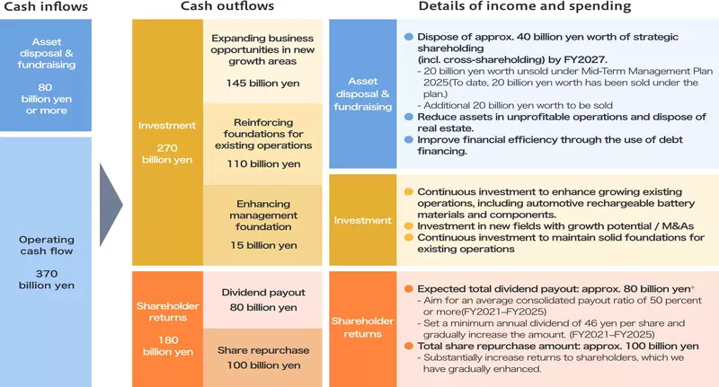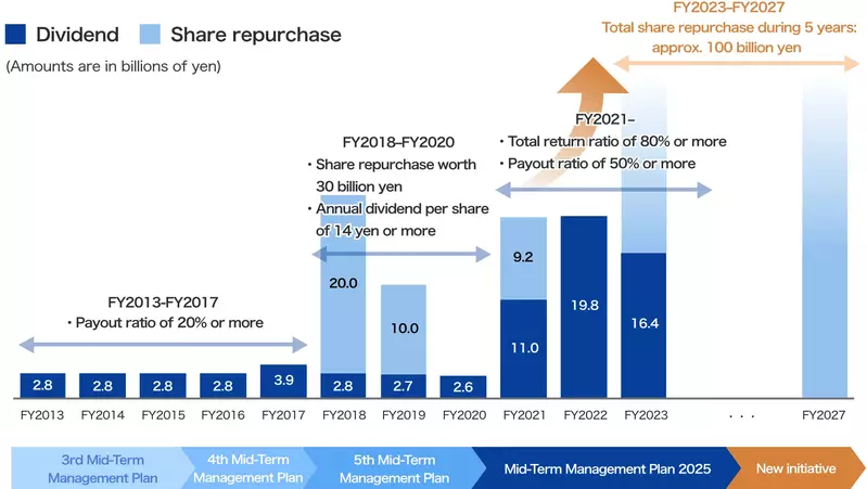 - Share buybacks: Cumulative total of approximately 100 billion yen over five fiscal years