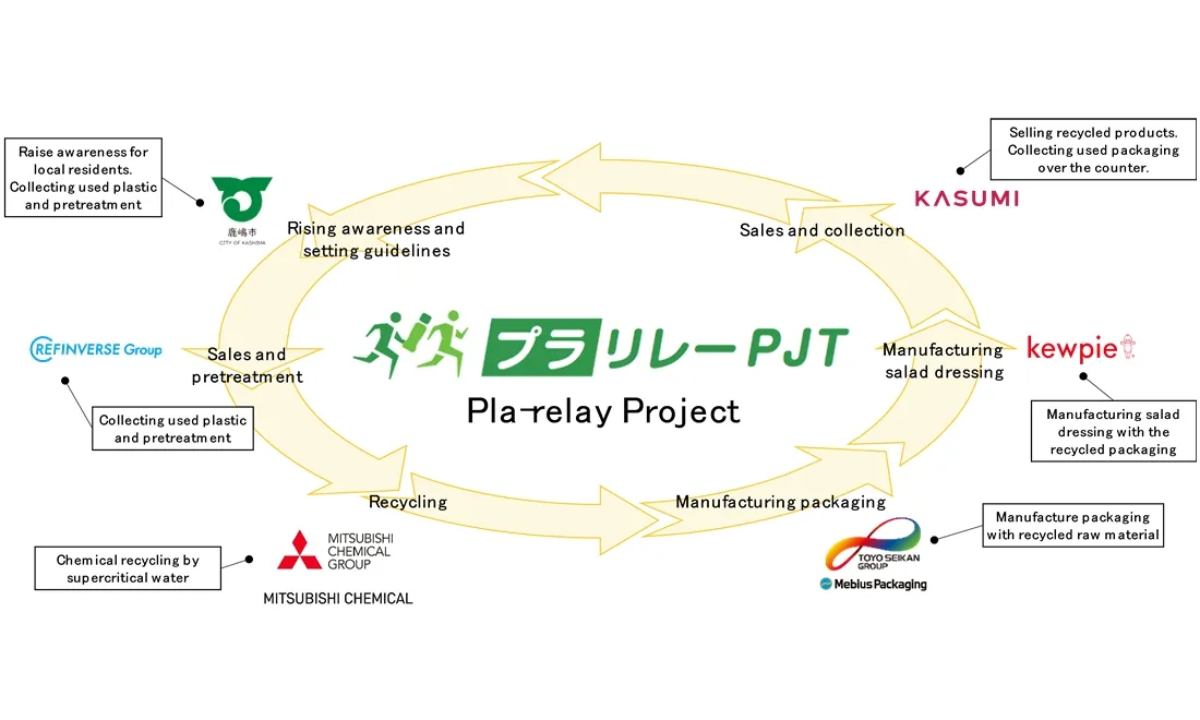 Six-party—Kashima City, Ibaraki Prefecture (Mayor: Shinichi Taguchi), REFINVERSE, Inc. (President and CEO: Akira Ochi, Headquarters: Chiyoda-ku, Tokyo), Mitsubishi Chemical Corporation (President and CEO: Manabu Chikumoto, Headquarters: Chiyoda-ku, Tokyo), Toyo Seikan Group Holdings, Ltd. (President and CEO: Takuji Nakamura, Headquarters: Shinagawa-ku, Tokyo), Kewpie Corporation (President and CEO: Mitsuru Takamiya, Headquarters: Shibuya-ku, Tokyo), KASUMI CO., LTD. (President and CEO: Fumitaka Orimoto, Headquarters: Tsukuba City, Ibaraki Prefecture)—are working together on the "Pla-relay Project," which aims to create a circular system for plastic containers. From September 2025 to November 2025, they crushed, liquefied, and regenerated dressing caps and PET bottle caps collected in Kashima City, Ibaraki Prefecture. *1 We are selling a limited quantity of dressing products that use caps molded from recycled materials after the recycling process was completed, realizing a circular cycle from collection to remanufacturing and sale.*2