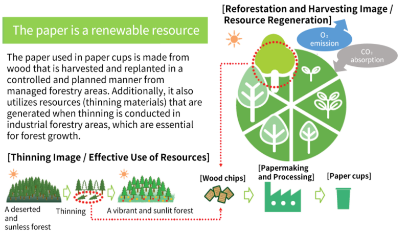 Tokan Kogyo manufactures and sells paper cups made from thinned wood. Thinning involves cutting down some trees to encourage the growth of the remaining trees and protect the health of the forest, and this wood is called thinned wood. By using thinned wood, we contribute to forest conservation and achieve sustainable resource use.