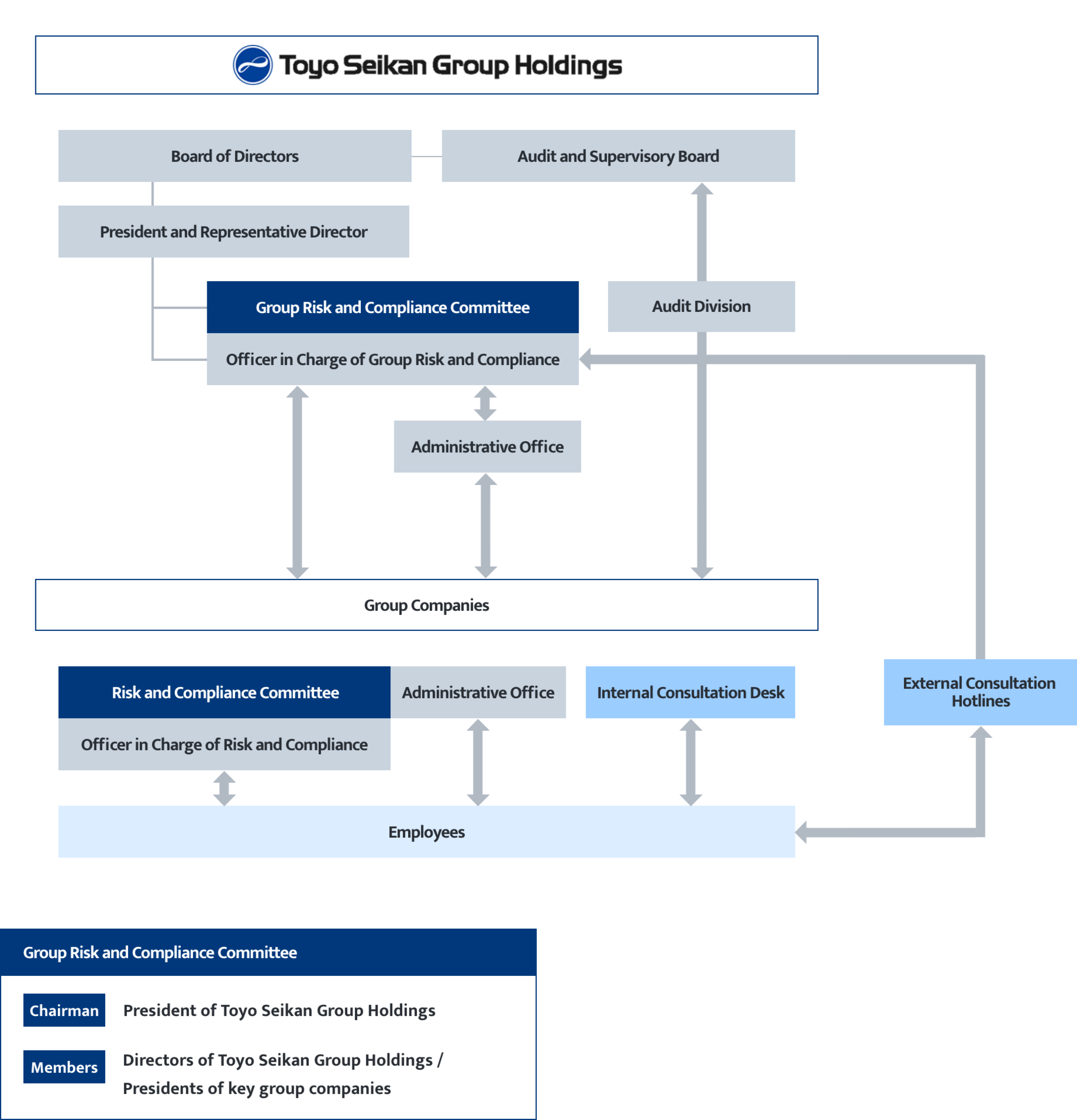 In fiscal 2019, the Board of Directors of both Toyo Seikan Group Holdings and Toyo Seikan resolved to "Declaration of Complete Separation from Cartel Involvement" regarding compliance with antitrust laws.