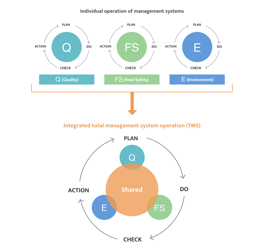 In particular, Toyo Seikan, TOYO GLASS, and Mebius Packaging have established an "Integrated Management System (TMS)" that integrates the operation of three management systems: quality, food safety, and the environment (ISO14001). By integrating the management systems, we have eliminated redundant operations, broadened our perspective from partial optimization to overall optimization, and are promoting manufacturing that is trusted by customers by using a "living system" that combines the management system with business activities.