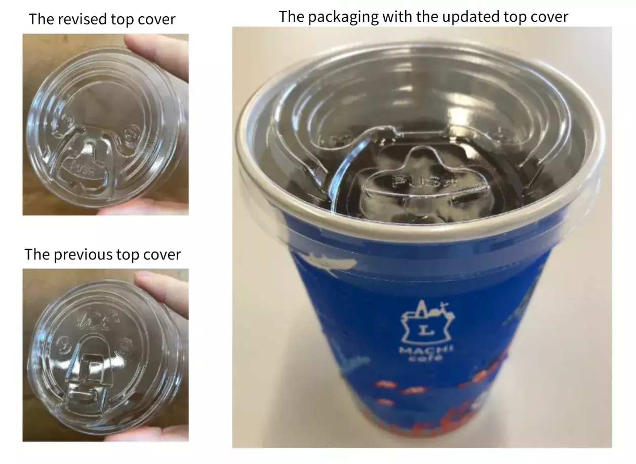 Therefore, we developed a lid that can be used to drink directly from the bottle, which uses less resin than the combined amount of a flat lid and plastic straw.