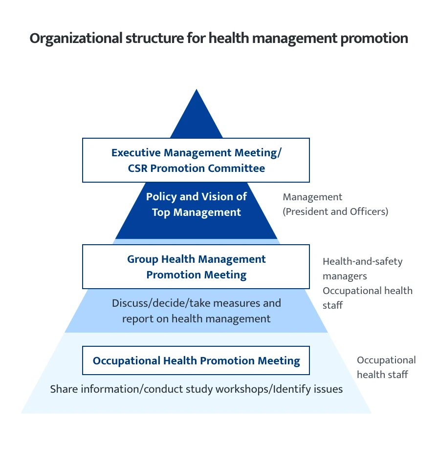 We have established a health and productivity management promotion system to realize the Group's personnel policy. To promote health and productivity management, we hold management-level meetings to confirm the overall policy for health and productivity management and the status of initiatives. In addition, the Group Health and Productivity Management Promotion Council sets common Group indicators and targets and implements the PDCA cycle to ensure "health and productivity management that produces results." We consider and decide on measures based on the results of health checkups and stress checks, and promote them with the aim of achieving our "ideal state" as a Group.