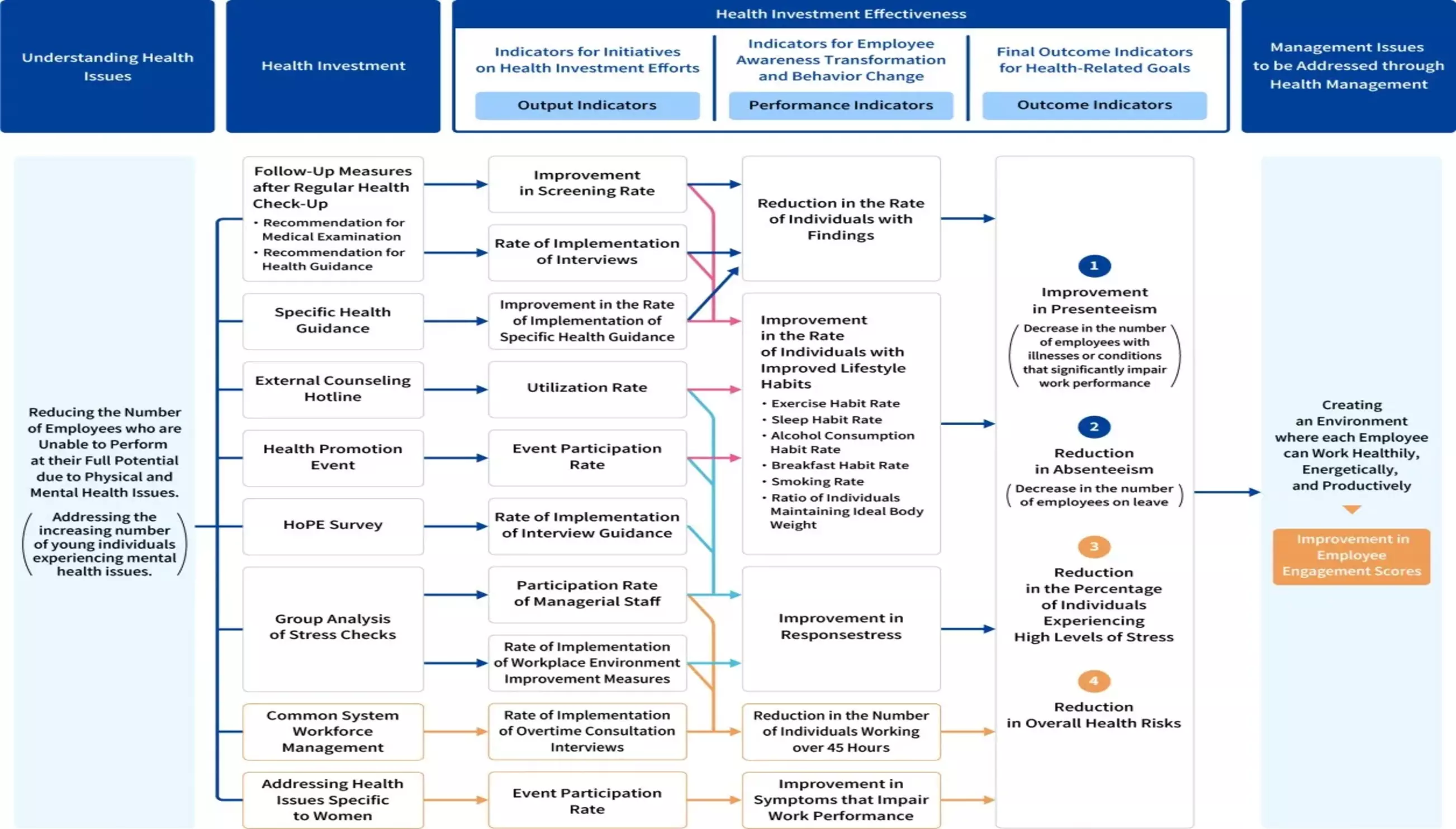 In promoting health and productivity management, we have created a Group-wide health and productivity management strategy map to identify health issues that can lead to the resolution of management issues and to translate them into specific initiatives to resolve these issues. By visualizing the story, we are increasing the effectiveness of our initiatives.