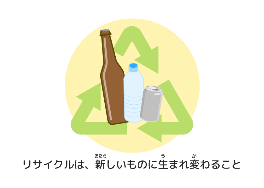 「リサイクル」は、使(つか)い終(お)わった物(もの)が、また新(あたら)しい物(もの)に生(う)まれ変(か)わること。リサイクルができれば、新(あたら)しく物(もの)を作(つく)るために地球(ちきゅう)のしげんを使(つか)ったり、木(き)を切(き)ったりする量(りょう)を減(へ)らせるんだ。ごみが燃(も)やされる量(りょう)も減(へ)るから、地球(ちきゅう)を暑(あつ)くする「二酸化炭素(にさんかたんそ)」も減(へ)らすことができるよ。リサイクルは、地球(ちきゅう)のしげんを大切(たいせつ)にしながら、ごみも減(へ)らせる、とってもすごい方法(ほうほう)なんだね。
