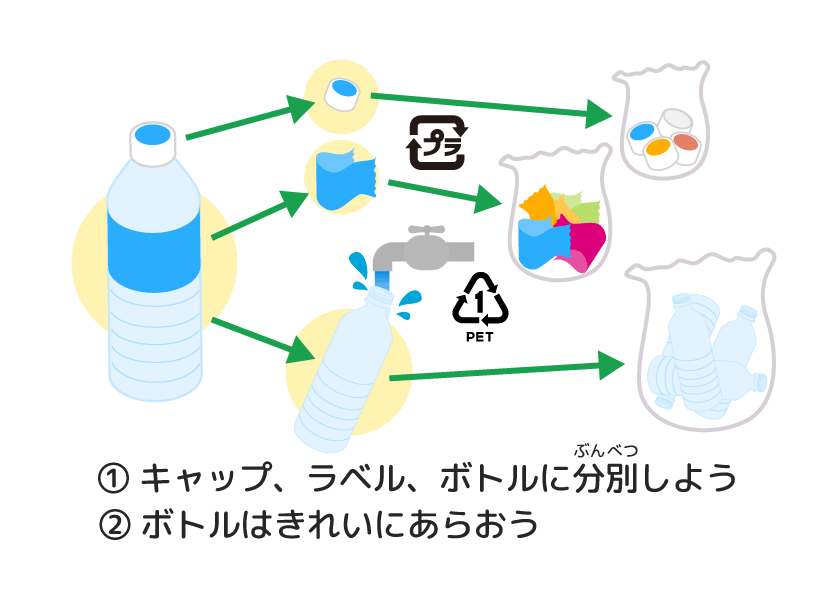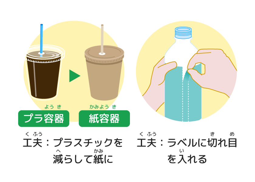 容器(ようき)には、リサイクルしやすいように、分別(ぶんべつ)マークがあったり、ペットボトルのラベルに切(き)れ目(め)が入(い)れてあったりするんだよ。