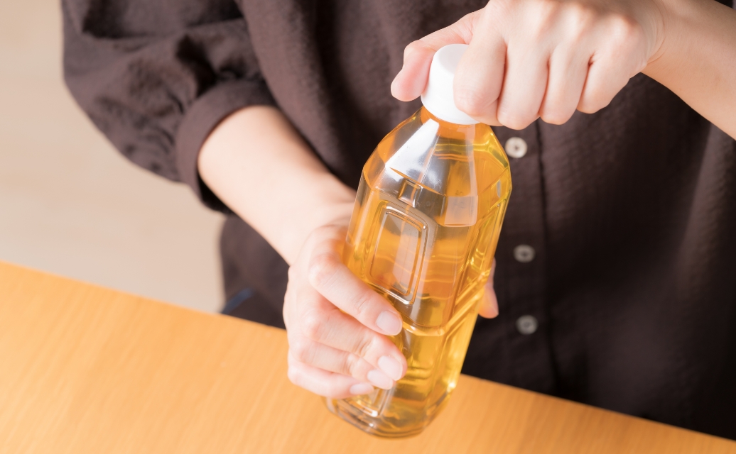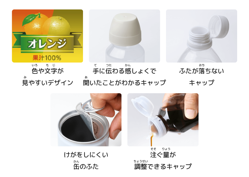 - ふたが落(お)ちないキャップ、けがをしにくい缶(かん)のふた、注(そそ)ぐ量(りょう)が調整(ちょうせい)できるキャップ