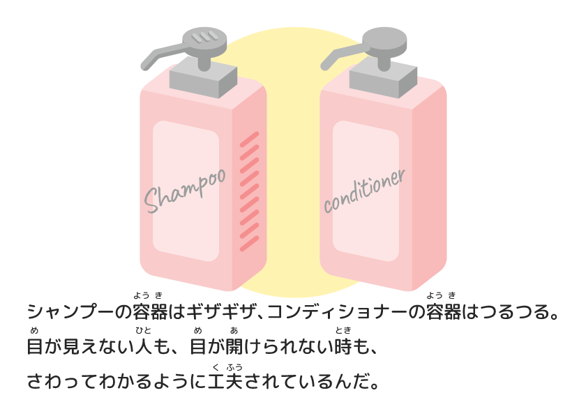容器(ようき)には、持(も)ちやすさ、開(あ)けやすさ、見(み)やすさ、安全性(あんぜんせい)など、たくさんのアイデアがつまっています。生活(せいかつ)のなかで、ユニバーサルデザインの容器(ようき)や、さまざまな容器(ようき)の工夫(くふう)を探(さが)してみましょう。