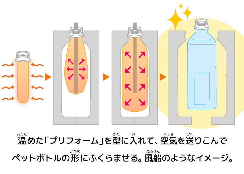 ペットボトルは、はじめに材料(ざいりょう)をとかして、小(ちい)さな試験管(しけんかん)のような形(かたち)にするんだよ。これを、ペットボトルの形(かたち)をした金型(かながた)に入(い)れ、空気(くうき)を送(おく)りこんでふくらませるんだ。風船(ふうせん)みたいに「ぷくーっ」とふくらんで、ペットボトルの形(かたち)になるんだよ。