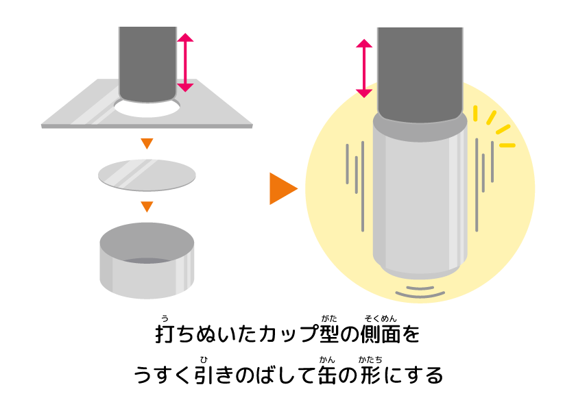 打(う)ちぬいたカップ型(がた)の側面(そくめん)を、うすく引(ひ)きのばして缶(かん)の形(かたち)にするんだよ。