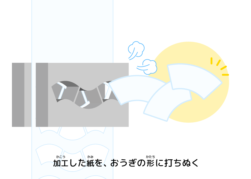 ジュースなどがしみこまないように加工(かこう)した紙(かみ)を、おうぎの形(かたち)に打(う)ちぬくんだ。それを丸(まる)めて、紙(かみ)コップの側面(そくめん)の部分(ぶぶん)を作(つく)るんだよ。