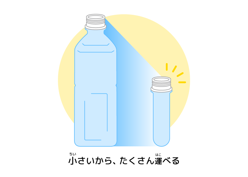 たとえばペットボトルは、ふくらませる前(まえ)の小(ちい)さな状態(じょうたい)で運(はこ)ぶんだよ。 こうすれば一回(いっかい)でたくさん運(はこ)べるから、トラックの走(はし)る回数(かいすう)を減(へ)らして、出(だ)す二酸化炭素(にさんかたんそ)も少(すく)なくできるんだよ。
