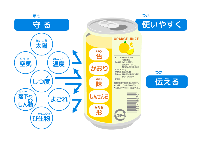 容器(ようき)には、中身(なかみ)を守(まも)る、使(つか)いやすくする、情報(じょうほう)を伝(つた)える、というみっつのやくわりがあります。わたしたちのくらしの中(なか)で、容器(ようき)はとても大切(たいせつ)な働(はたら)きをしているのです。