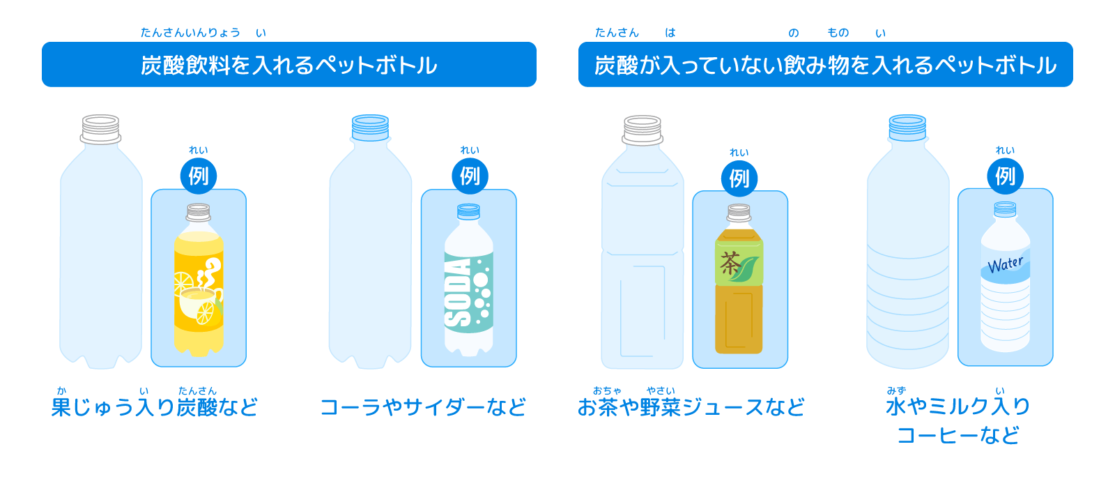 しかも、中身(なかみ)にあわせて作(つく)られているから、じょうぶなんだ。どんな種類(しゅるい)のペットボトルがあるか知(し)っているかな。