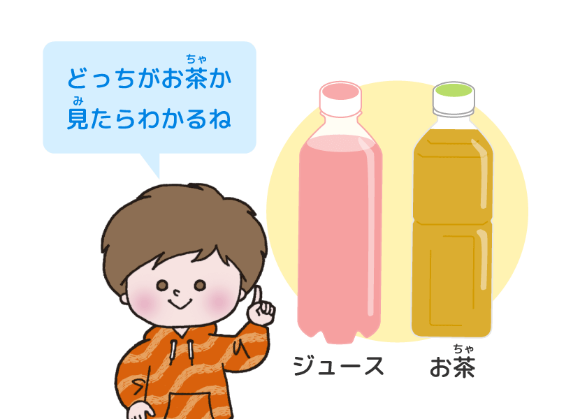 ペットボトルは中(なか)が見(み)えて、何(なに)が入(は)っているかわかりやすい。お茶(ちゃ)なのかジュースなのか、色(いろ)でわかるし、いちいち飲(の)んでたしかめなくてもだいじょうぶ。あとどのくらい残(の)っているかも、ひとめでチェックできるんだ。