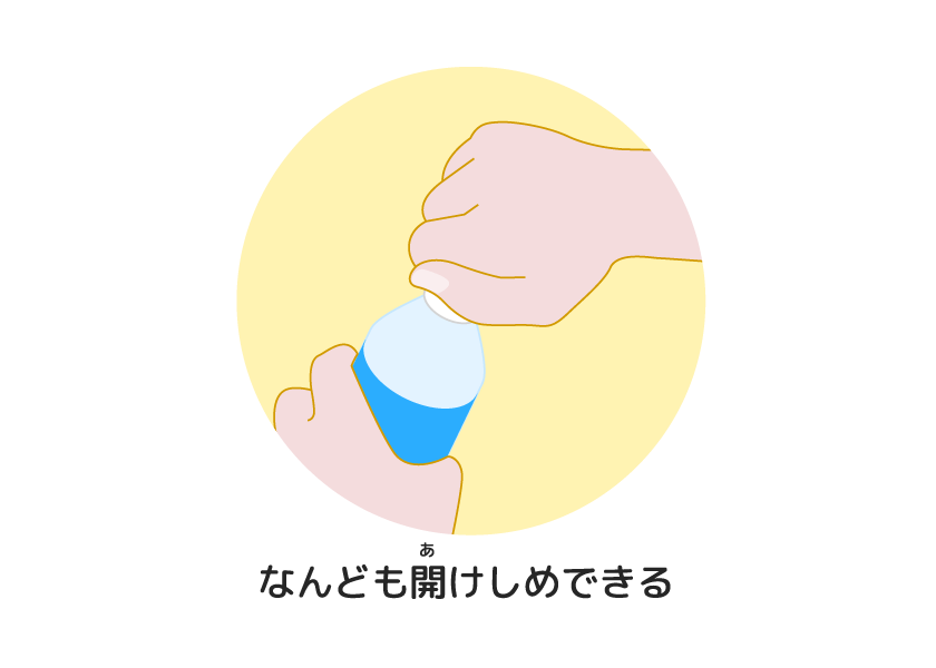 キャップがついているから、何度(なんど)も開(あ)けしめができる。カバンに入(い)れて運(はこ)んだり、遊(あそ)びに行(い)ったときに、少(すこ)しずつ飲(の)んだりする時(とき)にも、便利(べんり)だね!でも、一度開けたら、中身が悪くならないうちに、早めに飲みきってね。何日(なんにち)もおいておかないようにしようね。