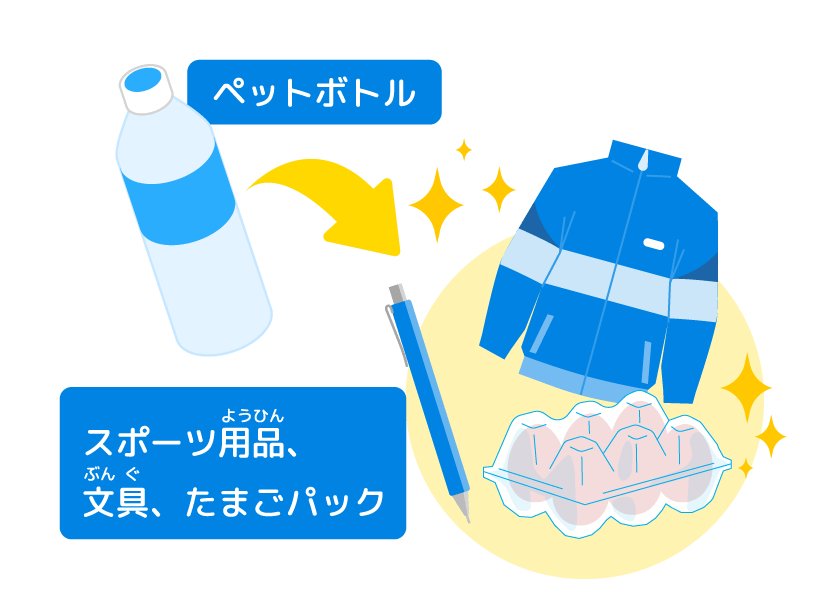 飲(の)み終(お)わった後(あと)は、リサイクルすればまたペットボトルになったり、たまごのパックや服(ふく)などに生(う)まれ変(か)わるんだ。