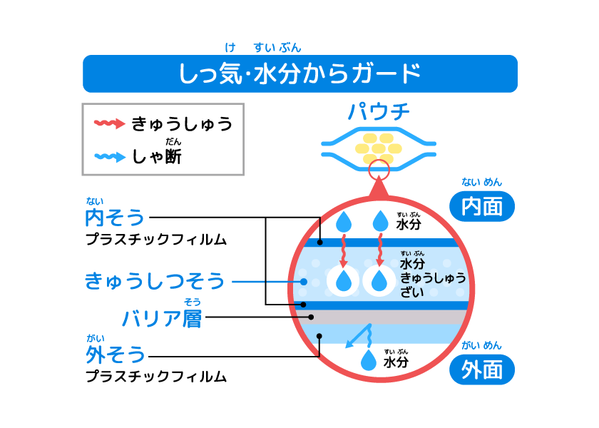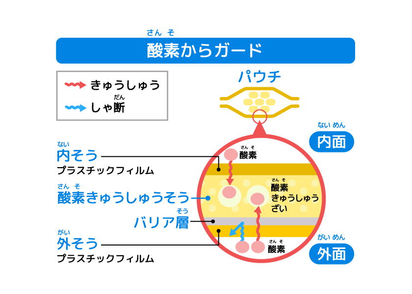 「あめやグミが入(はい)っているパウチ」ってただのふくろに見(み)えるけど、じつはすごい工夫(くふう)がされているんだよ!いちまいに見(み)えるこのふくろのフィルムは、いろいろなシートがなんまいにも重(かさ)なってできているんだ。みんなにとって大切(たいせつ)な空気(くうき)や水分(すいぶん)は、食(た)べ物(もの)の中(なか)に入(はい)ると、味(あじ)が落(お)ちたり、悪(わる)くなってしまうことがあるんだけど、この特別(とくべつ)なシートが、みんなの目(め)には見(み)えないバイキンや、空気(くうき)や水分(すいぶん)から、パウチの中身(なかみ)をしっかり守(まも)ってくれるんだ。