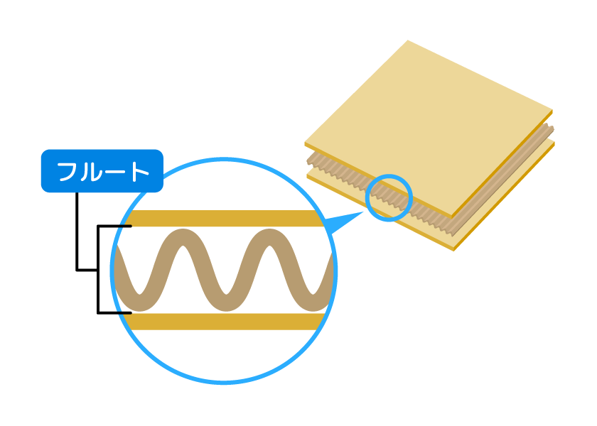 ダンボールの中(なか)をのぞくと、波(なみ)のような形(かたち)をした紙(かみ)が見(み)えるよね。この部分(ぶぶん)を「フルート」といって、山(やま)と谷(たに)がつづく形(かたち)になっているんだ。このフルートがあることで、空気(くうき)をふくんで軽(かる)くなるし、力(ちから)を分散(ぶんさん)してくれるから、重(おも)いものを入(い)れてもつぶれにくいんだよ。ダンボールが軽(かる)くてじょうぶなのは、この「フルート」のおかげなんだ。