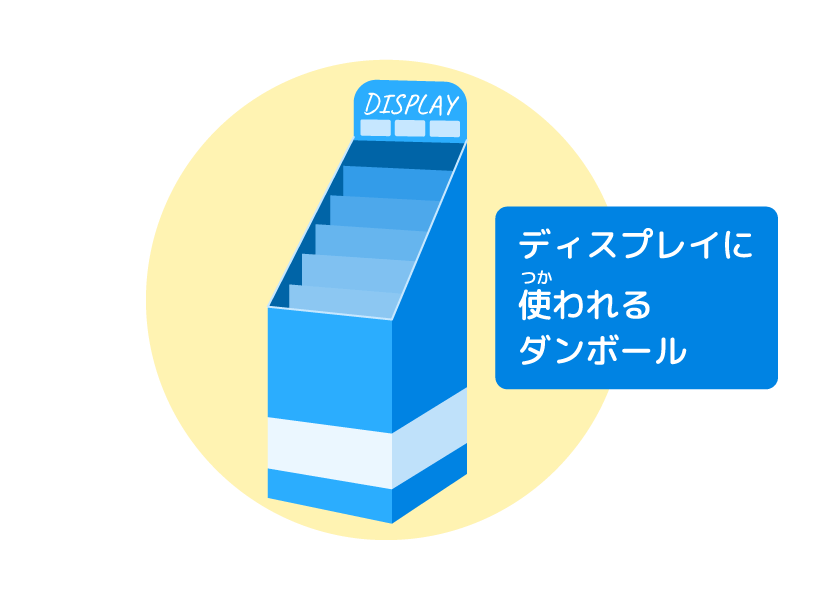 ダンボールは、荷物(にもつ)を送(おく)る時(とき)に使(つか)ったり、使(つか)わなくなったおもちゃを保管(ほかん)するのに使(つか)ってるよね。じつは、ダンボールは茶色(ちゃいろ)や白色(しろいろ)だけでなく、おしゃれな色(いろ)や形(かたち)にもできるんだよ。おしゃれなダンボールに荷物(にもつ)を入(い)れてお店(みせ)に送(おく)って、お店(みせ)でダンボールを開(あ)けて荷物(にもつ)を取(と)り出(だ)し、そのダンボールを組(く)み立(た)てて、そのまま商品(しょうひん)をかざったりすることもできるんだ。ほかにも、テントになるダンボールもあって、遊(あそ)ぶ時(とき)にも、災害(さいがい)でひなんした時(とき)にも使(つか)うことができるんだ。すごいよね。