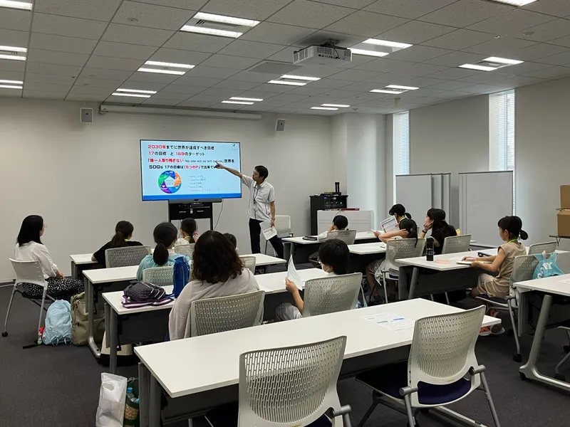 「容器×サステナビリティ」と題して、SDGsのさまざまな課題に配慮した容器について学ぶ、小学校高学年向けのワークショップを実施し、皆さん真剣に講義に耳を傾けていました。