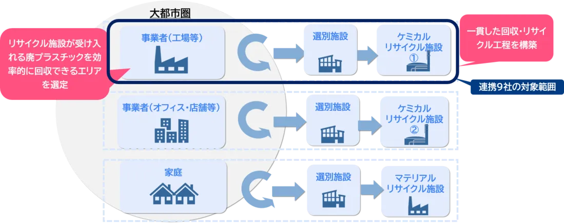 近年、世界的な資源制約や環境問題に対応するため、循環経済(サーキュラーエコノミー)への移行が加速しています。日本でも資源自律経済の実現を目指した取組が進められていますが、再生材の利用拡大や地域循環システムの構築は途上にあり、自治体間の更なる連携や、分別・回収・再資源化の高度化・スキーム構築が課題となっています。経済産業省は、広域的な循環システムの構築と、再生材の安定供給に向けた各種施策を進めており、株式会社三菱総合研究所(代表取締役社長:籔田健二)が上記事業の委託先に採択され、三菱ケミカル、日本ポリエチレン、日本ポリプロ、カナオカホールディングス、大日本印刷、東洋製罐グループホールディングス、三井物産、三井物産流通グループ、リファインバース(以下「連携9社」)も大都市圏において本実証に参画する運びとなりました。