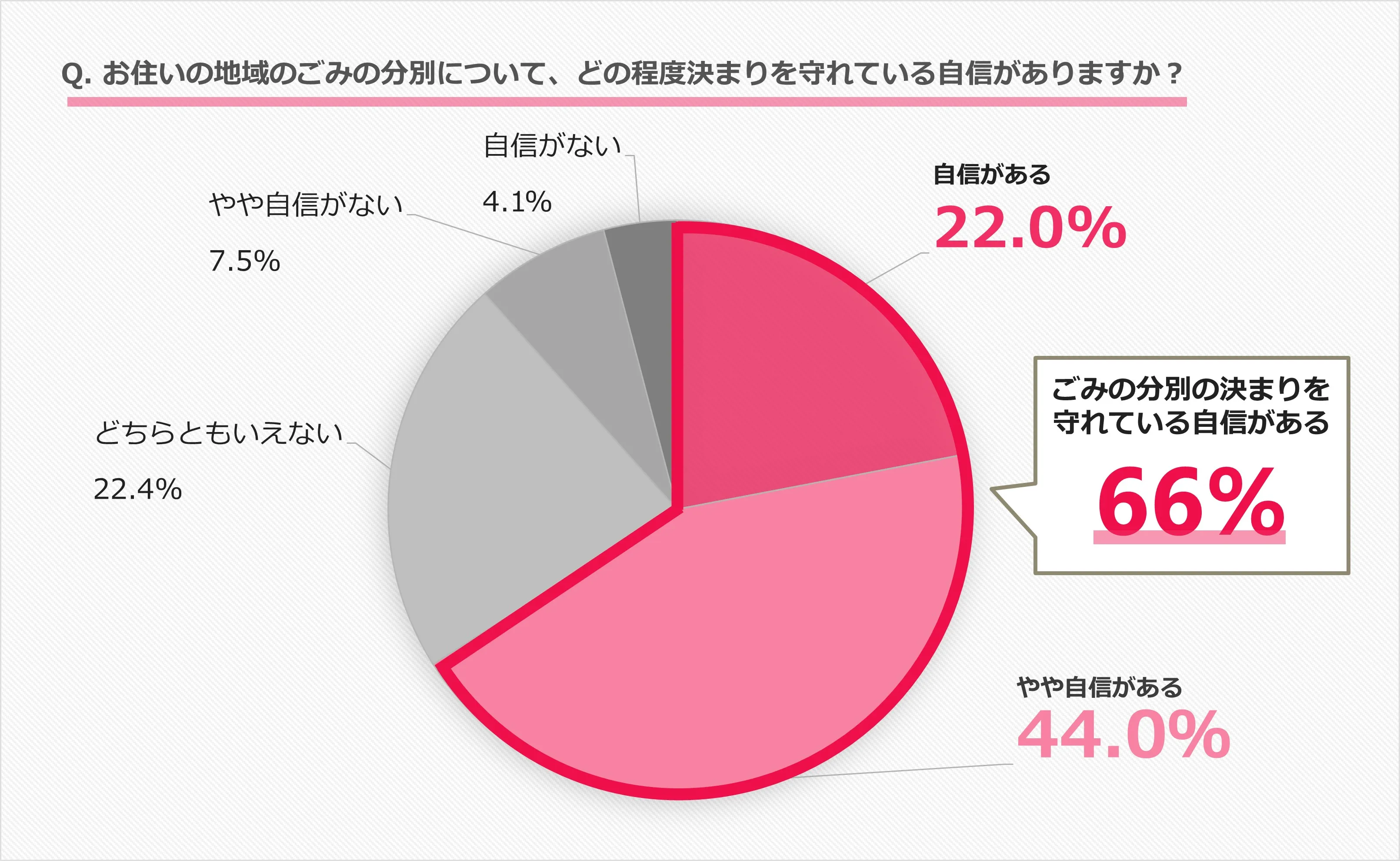 回答者の6割強が、お住まいの地域で定められた分別ルールを守れている「自信がある」と回答しました。日常の分別行動に一定の自信がうかがえます。