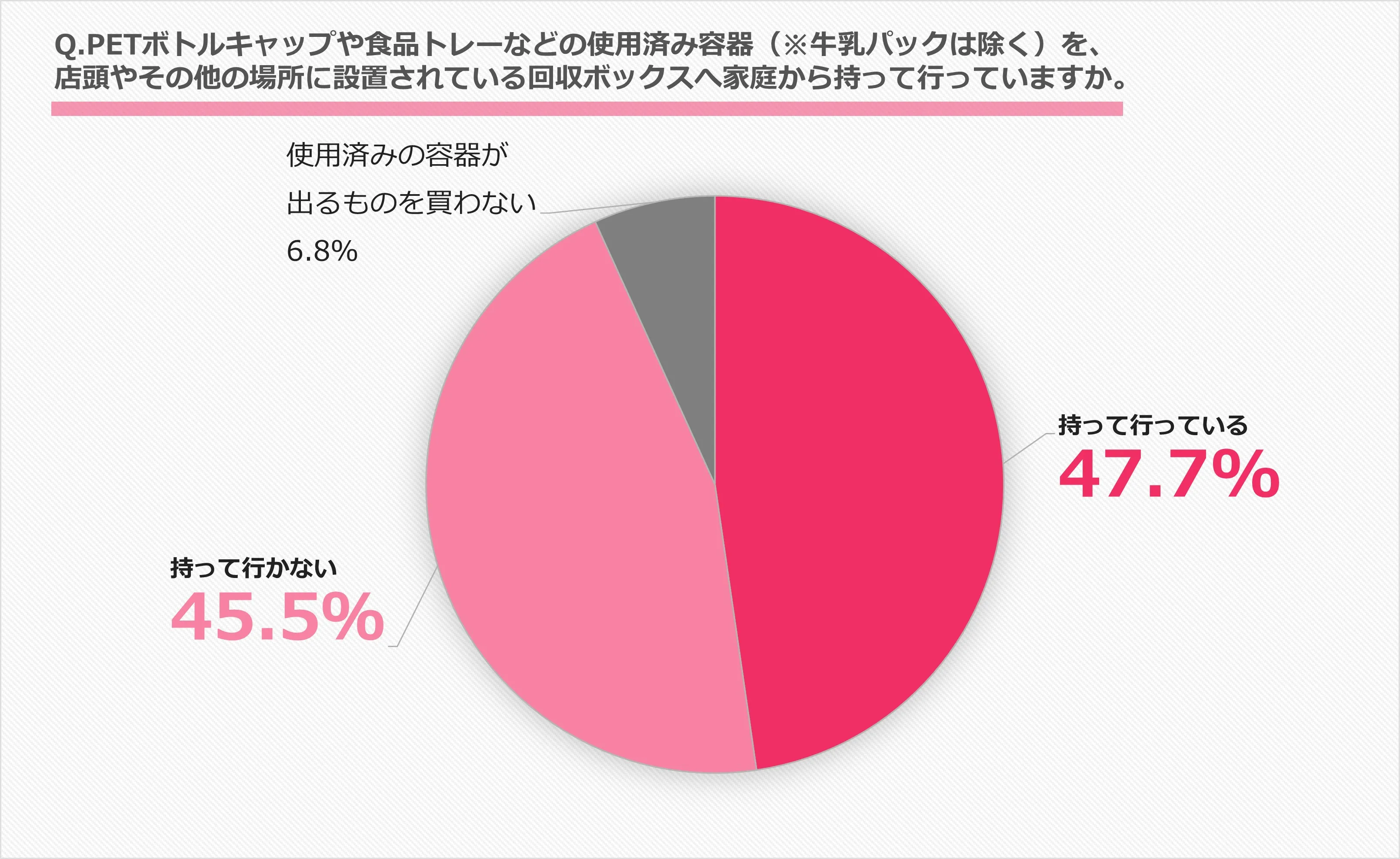 使用済み容器を回収ボックスへ持参するかを調査したところ、「持って行っている」と「持って行かない」という回答がほぼ半数に割れる結果となりました。あわせて回収ボックスの利用を促進する条件を調査したところ、以下が多く挙げられました。・回収場所が生活範囲にある・自宅のゴミ捨て場に回収ボックスがある・ポイント等のインセンティブが貰える 生活圏内で無理なく利用できる回収拠点の整備や、参加しやすさを高める仕組みづくりにより、回収ボックスの利用率向上が期待できまる結果となりました。