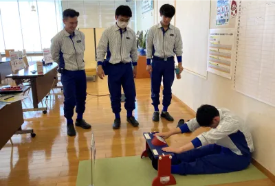 研修は三部制で、第一部は外部講師を招いて「メンタルヘルスの基礎知識」「職場でのメンタルヘルス対策」などをお話しいただきました。第二部は社内安全管理者から安全活動報告と、労働災害の中でも増加傾向にある転倒防止についての講習を受けました。第一部・二部には合計144名が参加しました。第三部は外部講師を招いた講習で、倒れている方に対する救命法とAEDの使用方法について27名が受講しました。